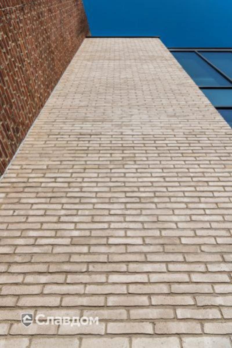 Terca Latero Basalto – керамический облицовочный кирпич ручной формовки размером 218х102х50 мм. Цвет бежево-белый, поверхность с легкими потертостями. Край кирпича рваный, не обработанный. Произведен в Бельгии.